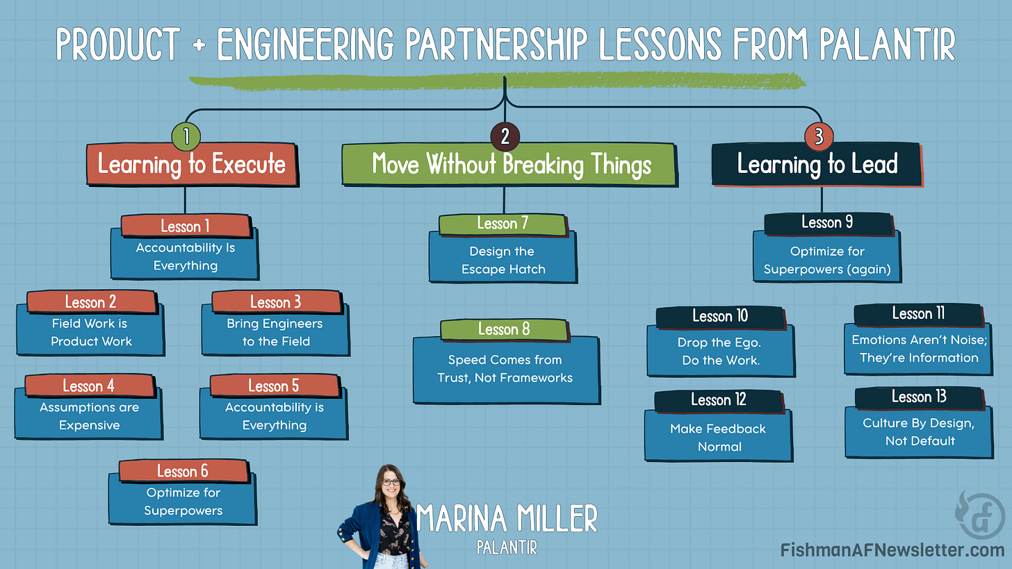13 product-building lessons from Palantir. Marina Miller shares how accountability, embedded user observation, and trust (over process) help turn ideas into outcomes at Palantir