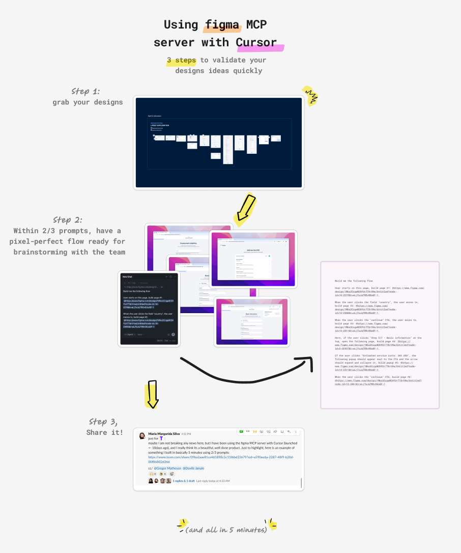 Enhancing Figma MCP Server with Cursor. Maria Margarida compares Cursor + Figma MCP to v0/Lovable, finding faster, near pixel-perfect flows from single prompts with minimal iteration. Her two quick examples show multi-page interactions and validations built in minutes, with minor follow-ups to polish UI behavior